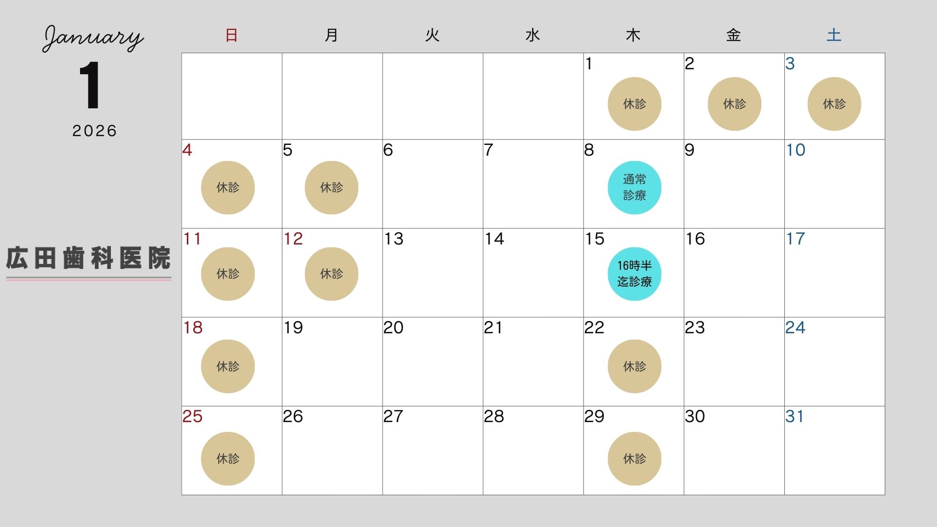 2025.12.5 1月の診療スケジュール 2026年度の診療は1月6日月曜より通常診療開始いたします。 振替診療で1月8日木曜は通常診療行います。 1月15日木曜は16時半まで振替診療とさせていただきます。 < 前の記事 新着一覧